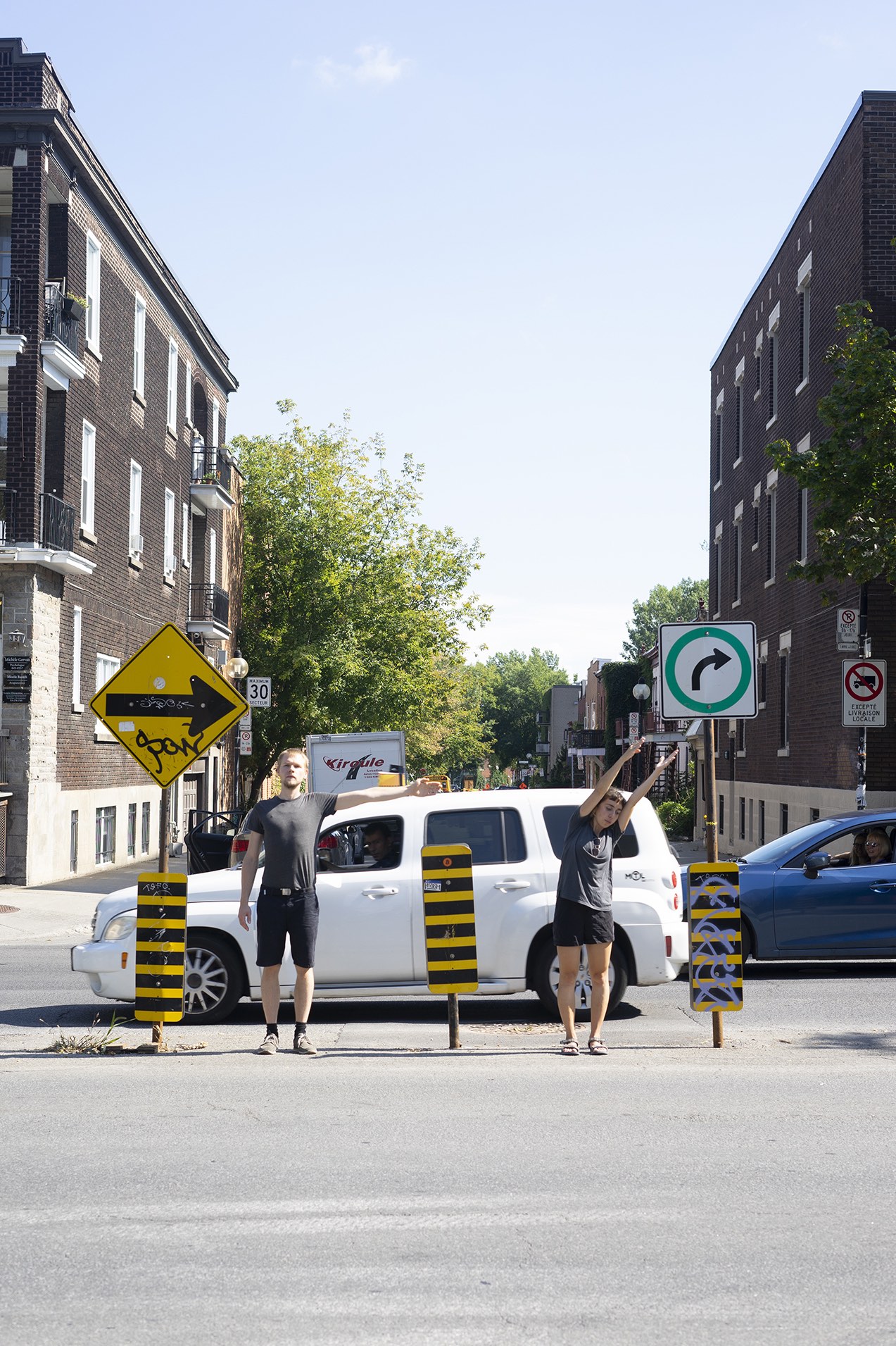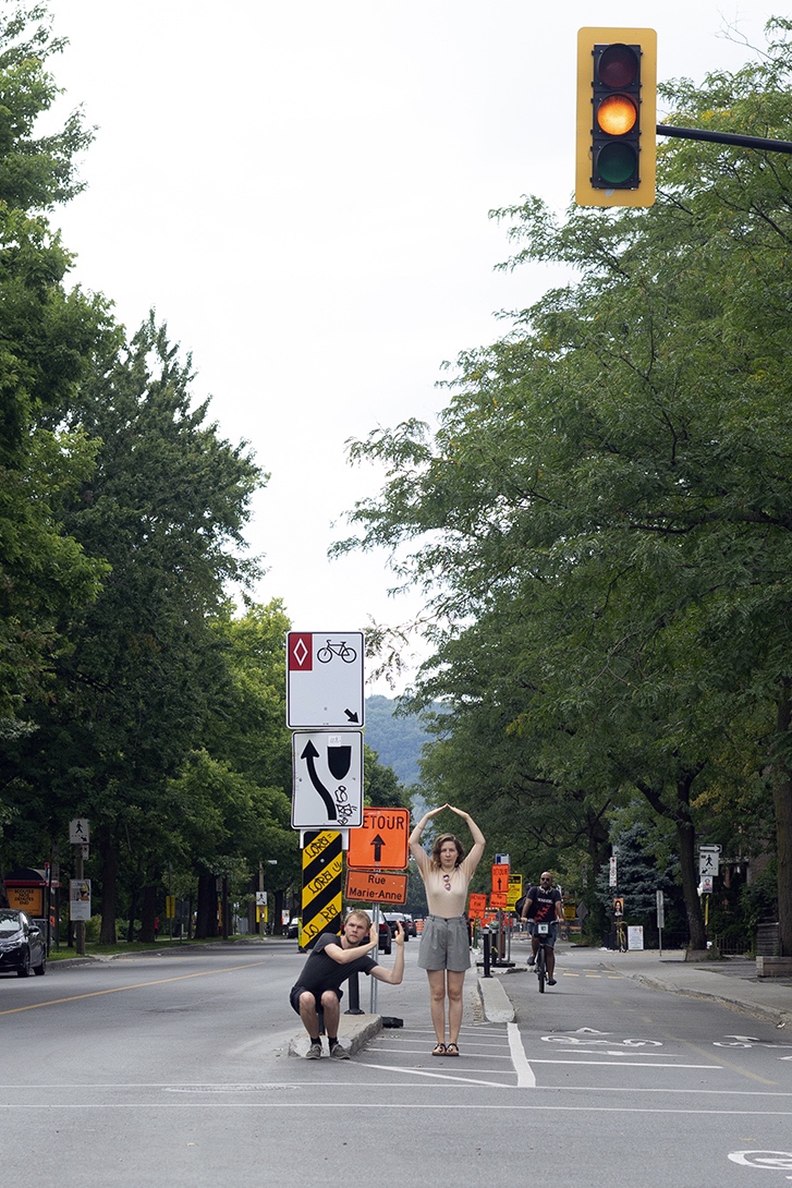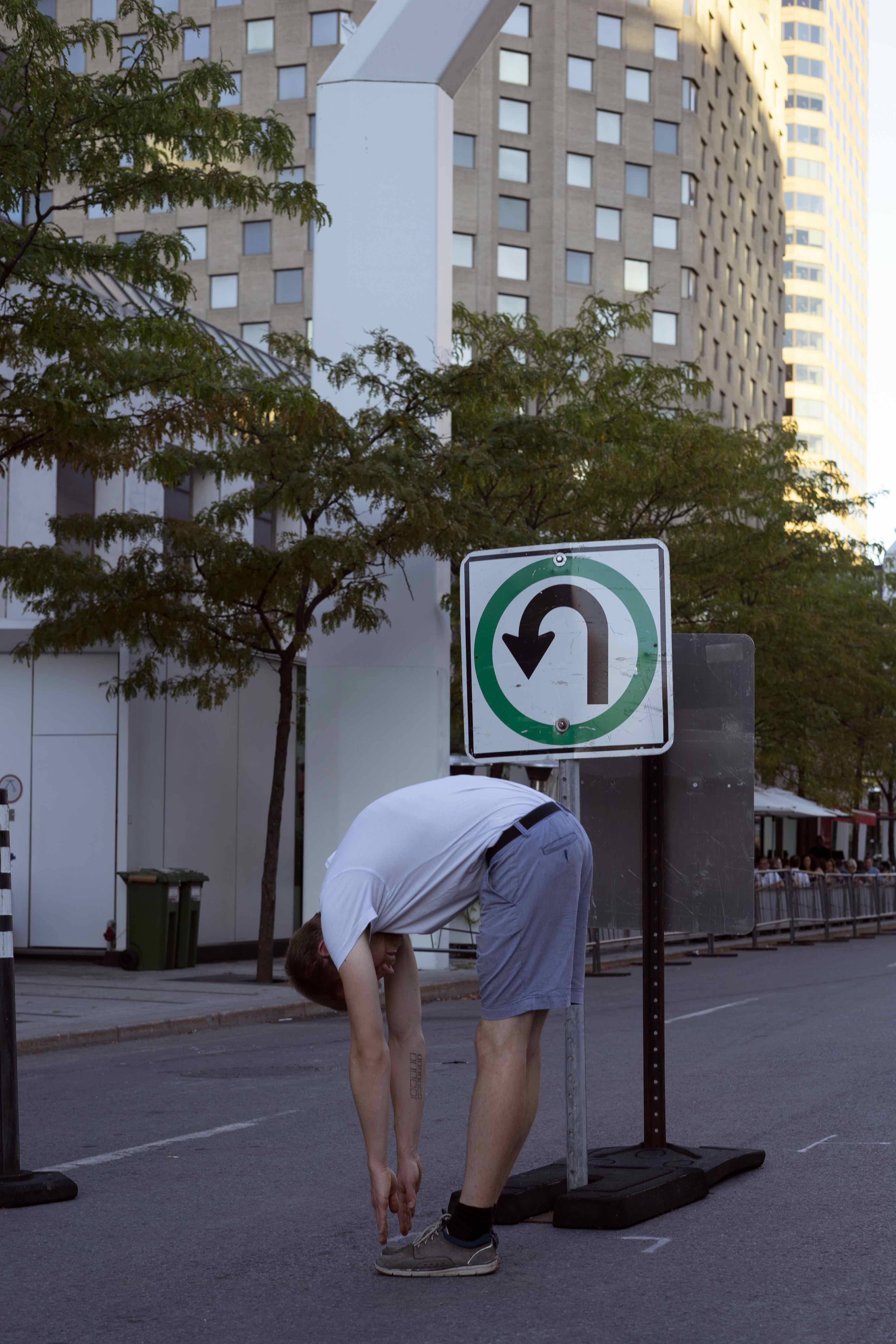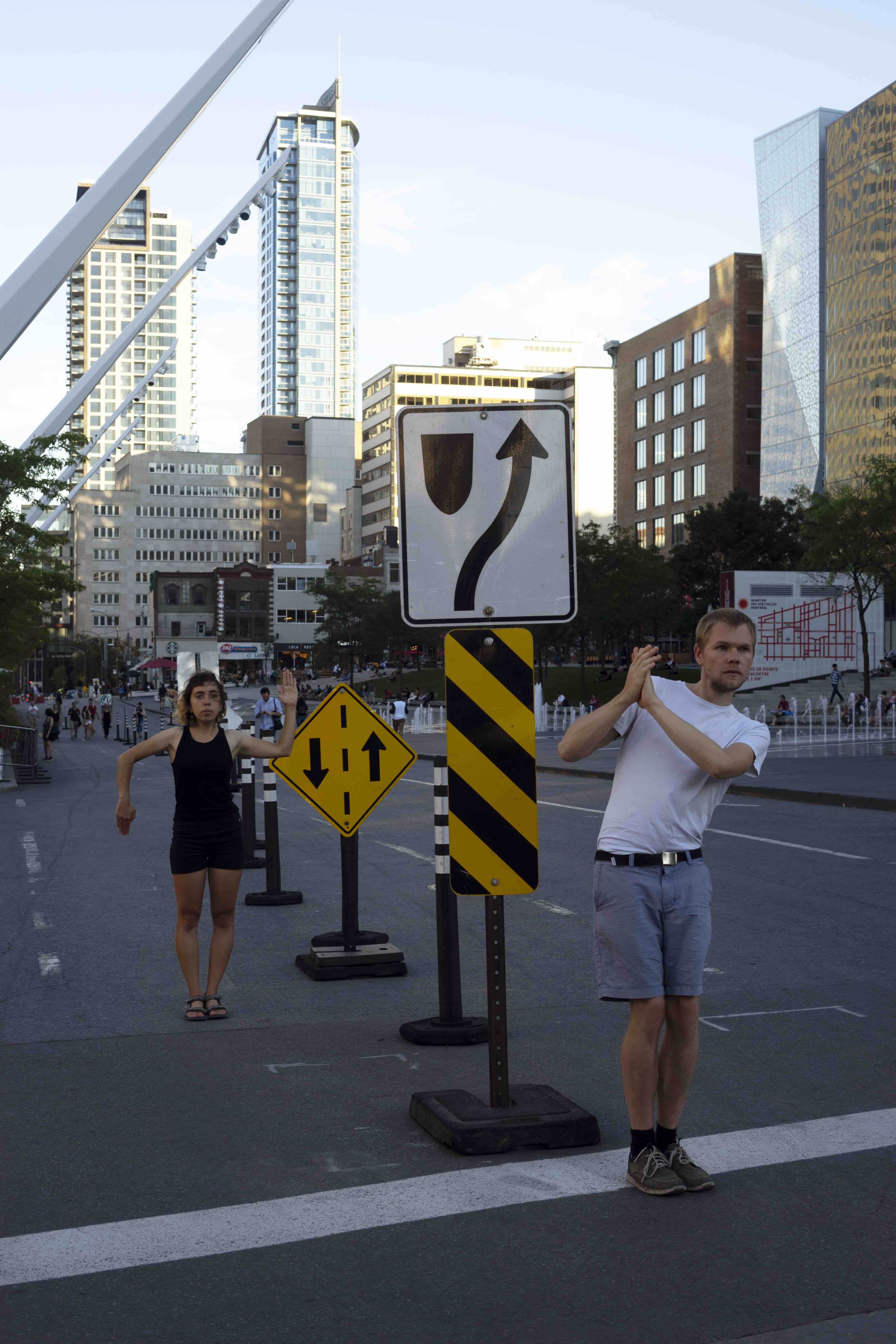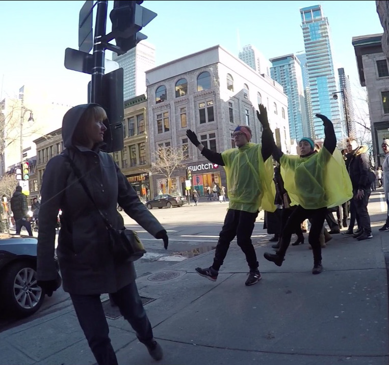 The performance was conducted three times in downtown Montreal (around Boulevard René-Lévesque and Sainte Catherine Street). Pedestrians reacted irritated, amused, annoyed and some tried to immitate the movement of the performers. In all cases, the performance had an impact on the flow of pedestrians and interfered with the urban system.
