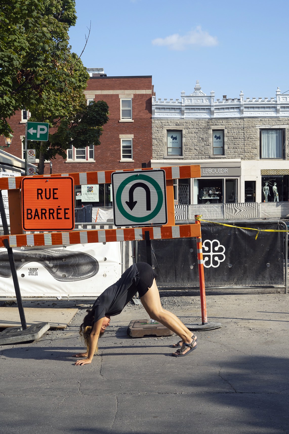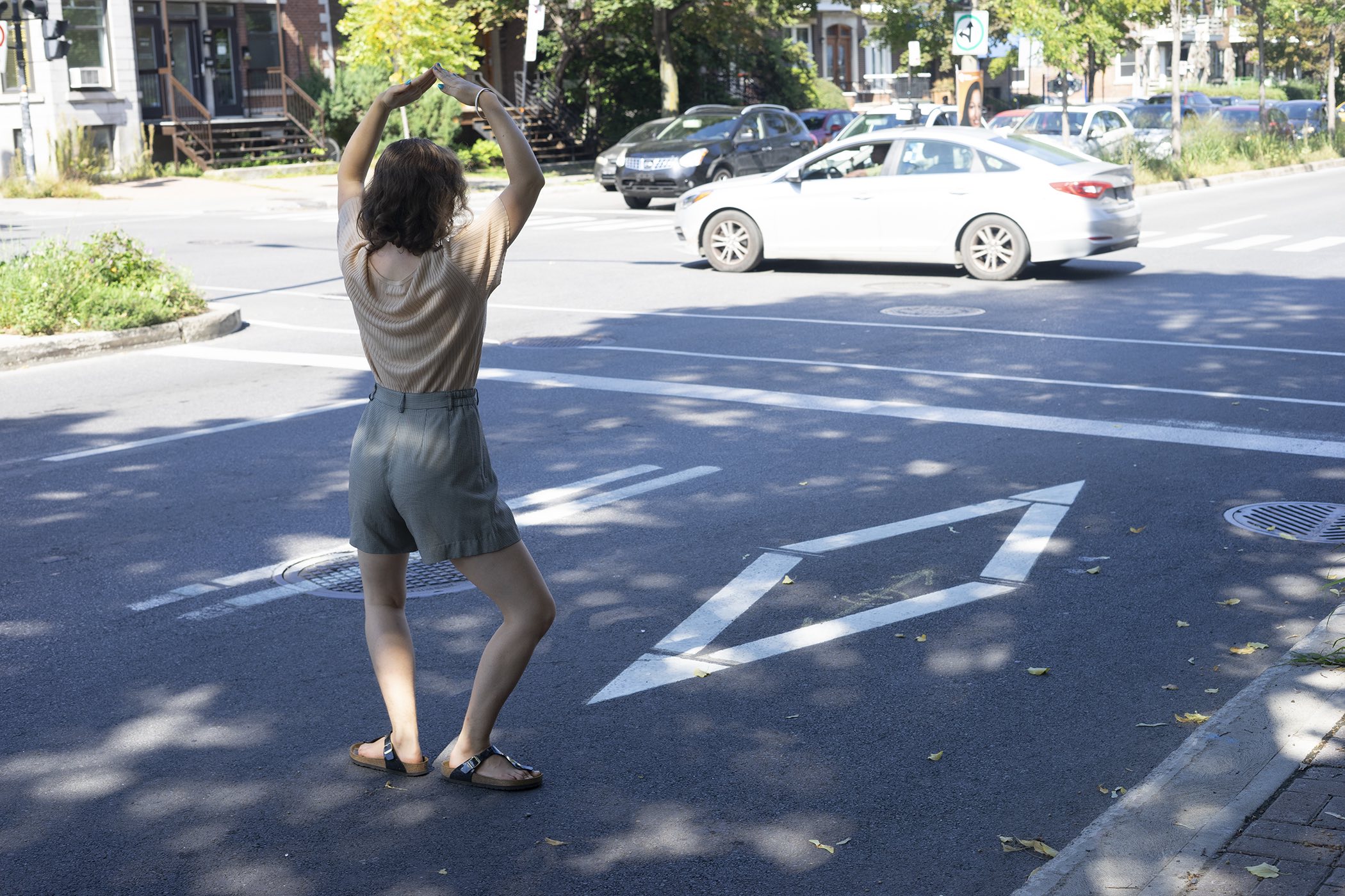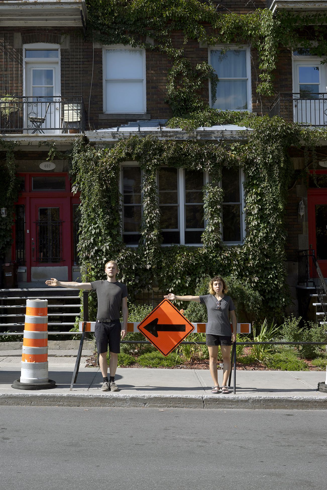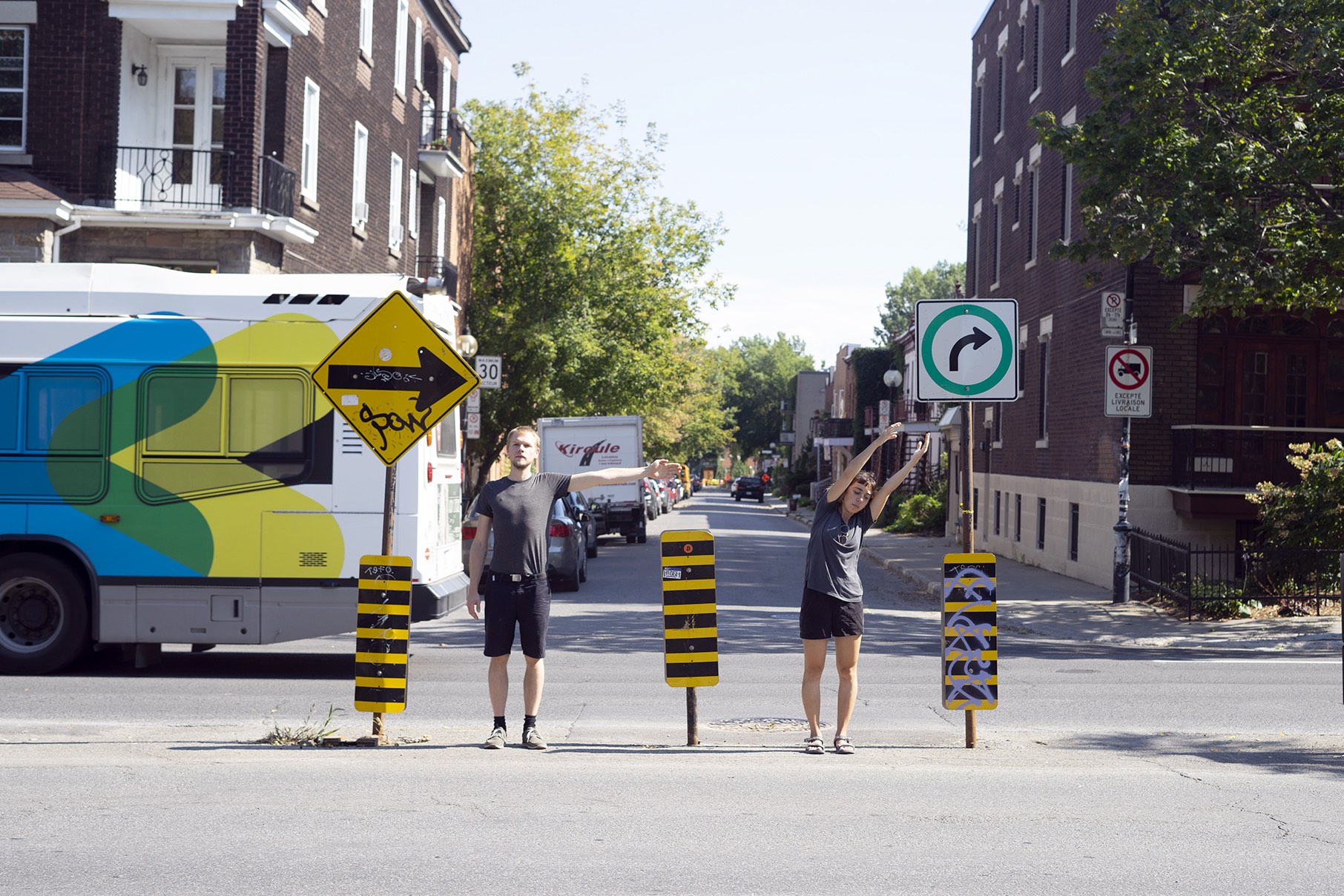 The performance was conducted three times in downtown Montreal (around Boulevard René-Lévesque and Sainte Catherine Street). Pedestrians reacted irritated, amused, annoyed and some tried to immitate the movement of the performers. In all cases, the performance had an impact on the flow of pedestrians and interfered with the urban system.
