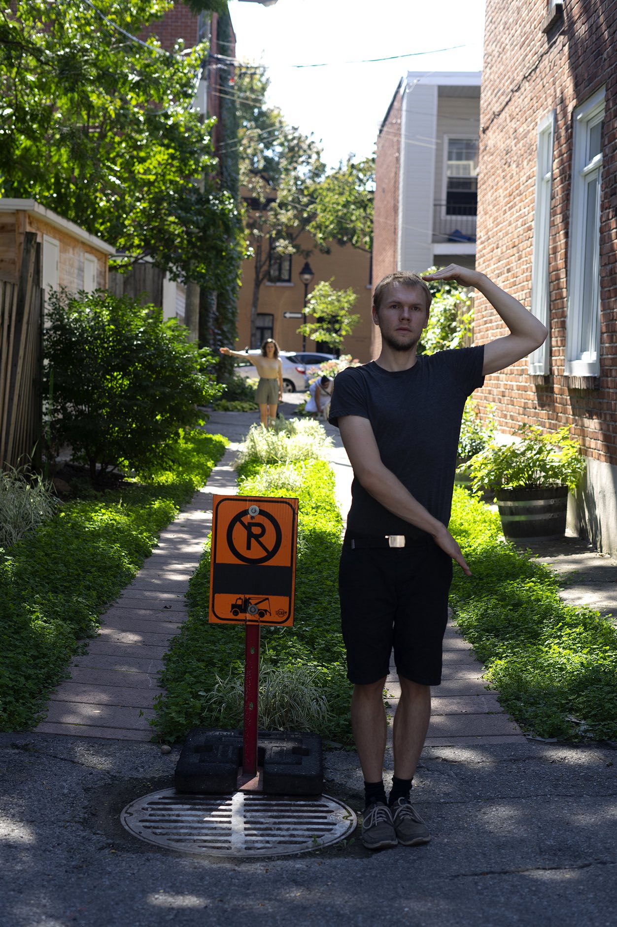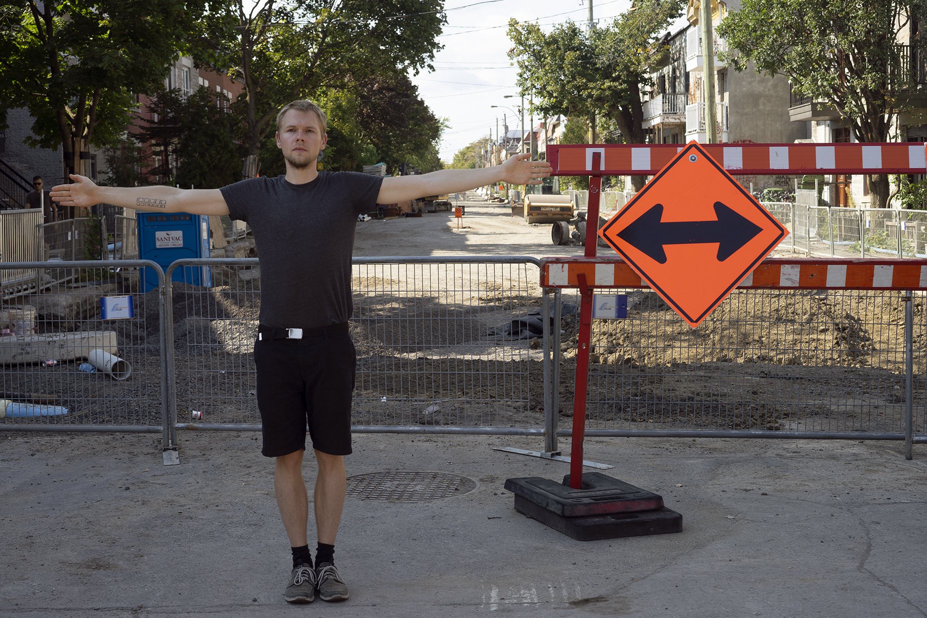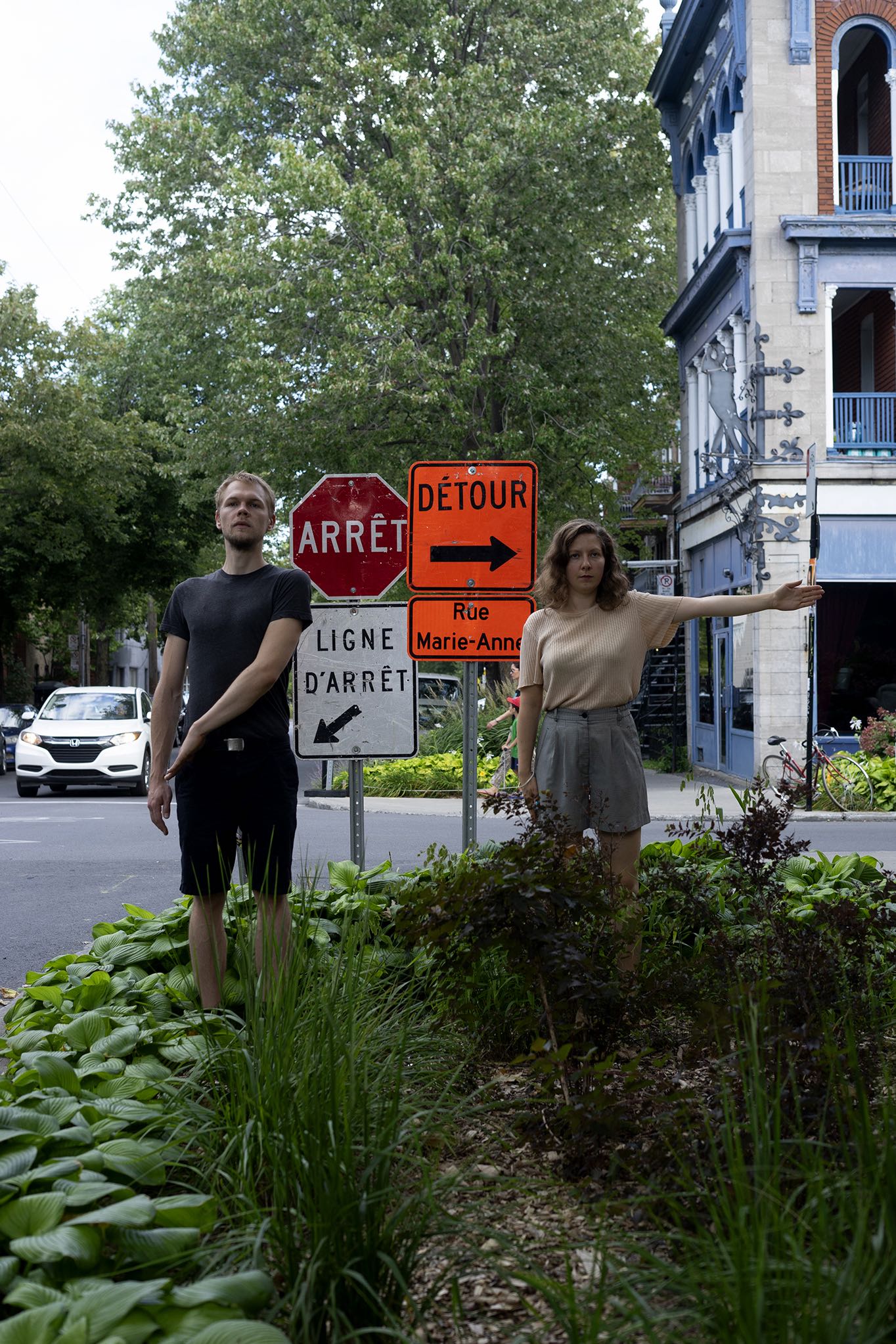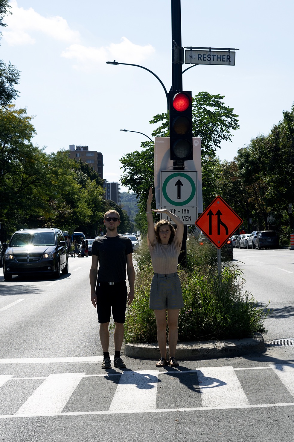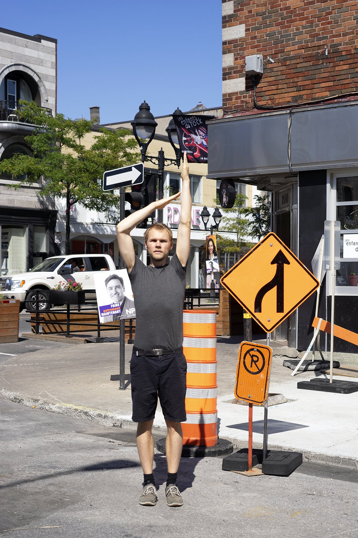The performance was conducted three times in downtown Montreal (around Boulevard René-Lévesque and Sainte Catherine Street). Pedestrians reacted irritated, amused, annoyed and some tried to immitate the movement of the performers. In all cases, the performance had an impact on the flow of pedestrians and interfered with the urban system.